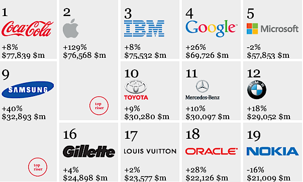 Hodnotu značky Coca-Cola vyčísluje Interbrand na 78 mld. USD s meziročním 8% nárůstem, Apple na druhém místě zaznamenal 129% nárůst – což bylo nejvíce z první stovky. Čtvrté místo pak náleží Googlu, jehož hodnota za rok vzrostla rychleji než u Microsoftu.