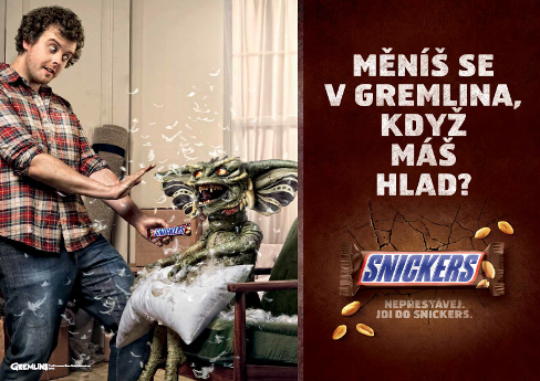 Od 1. září nasadí značka Snickers, z portfolia společnosti Mars, do televize nový spot. Podrážděnou Joan Collinsovou vystřídá postavička Gremlina, známá z hororu z 80. let. Komunikace značky se dále drží v duchu konceptu „Když máš hlad, nejsi to ty“, který ukazuje symptomy provázející hladové lidi. Po fyzické slabosti, podrážděnosti nastupuje nyní nesnesitelná zlost. Komunikační „hladový“ koncept byl celosvětově poprvé představen v roce 2010, na český trh byl uveden o dva roky později.