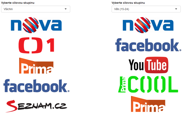 Median rovněž sestavil žebříček TOP 5 médií podle času stráveného konzumací jednotlivých kanálů v různých sociodemografických cílových skupinách. U většiny cílových skupin je patrná dominance tří největších českých televizních stanic a mění se v zásadě jen pořadí druhých dvou, nicméně u vybraných cílových skupin televizní hegemonii nabourávají i ostatní mediatypy. Například u nejmladší věkové kategorie se na 2. a 3. příčku zařadily Facebook, resp. You Tube, do TOP 5 pro lidi od 45 let patří i rádio Impuls a pro nejstarší Čechy také kanály ČT 24, nebo TV Barrandov.