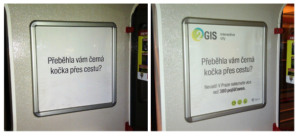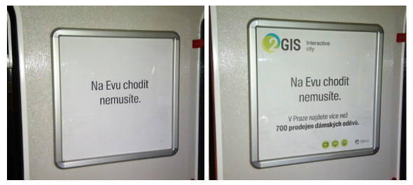 Od 1. března pak byly vizuály doplněny logem a informací, kde si lze vybrat z bankomatů, dobře se najíst či napít pomocí 2GIS.