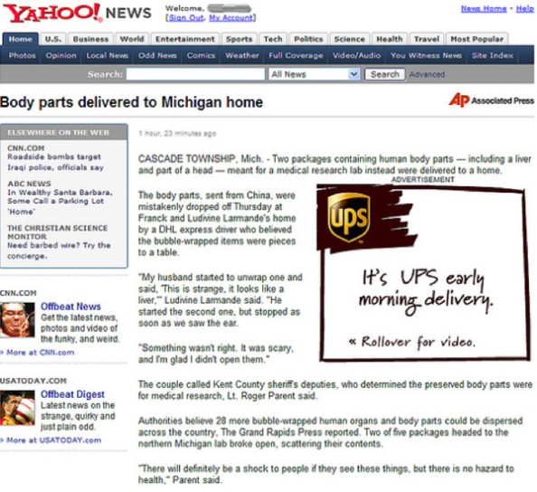 Na nástrahy kontextuálního cílení, jehož úkolem je zvýšit míru prokliku na základě podobnosti obsahu, ale někdy nestačí ani sofistikované programy. Následující galerie přináší desítku příkladů, kdy marketéři s umístěním reklamy spojeni příliš nebyli. Stačí se jen začíst do zpravodajských titulků…