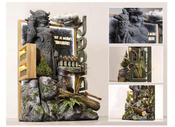 Radegast hořké regálové čelo, pod nímž je podepsáno studio Fajný design, bylo použito v rámci pilotního programu společnosti Plzeňský Prazdroj. Cílem bylo, aby lidé zažili značku na vlastní kůži, a proto byla v obchodech vytvořena místa lákající nakupující k interakci. Součástí byla ručně modelovaná skála, divoká zeleň, realisticky vypadající mech, nasvícené police i jezírko s tekoucí vodou, v němž byly umístěné vychlazené plechovky. Celý koncept byl doplněn prvkem dřevěné klády s výzvou „Zvedni a zažij sílu přírodu“ – těm, co výzvu přijali, se rozezněl orchestr ve formě hromů a blesků.