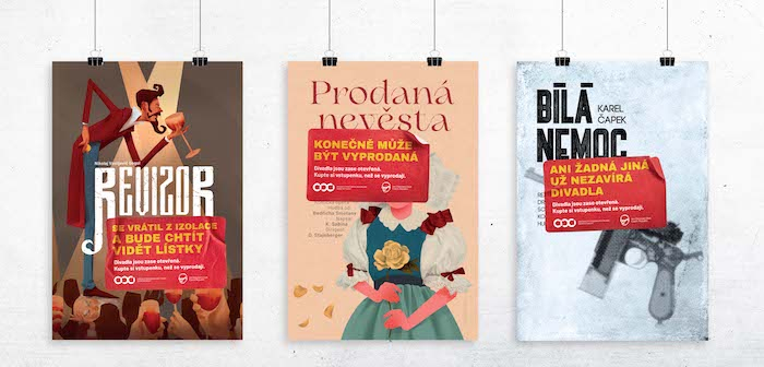Klíčové vizuály byly inspirovány historickými plakáty klasických děl, a to konkrétně Bílou nemocí, Prodanou nevěstou a Revizorem. Vizuální složku doplňují hravé a lehce humorné headliny jako „Bílá nemoc ani žádná jiná už nezavírá divadla“.