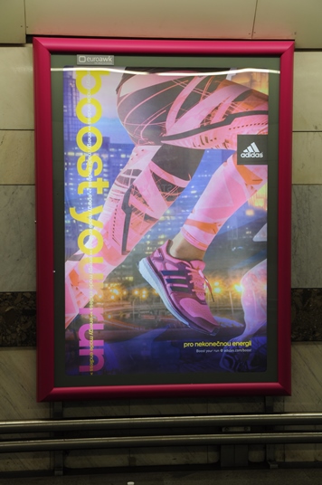 Značka adidas v rámci své nové kampaně na podporu běžecké kolekce a obuvi adidas Energy Boost pro ženy realizuje i netradiční růžový polep rámu CLV v metru. Rám tak ladí s celým vizuálem.