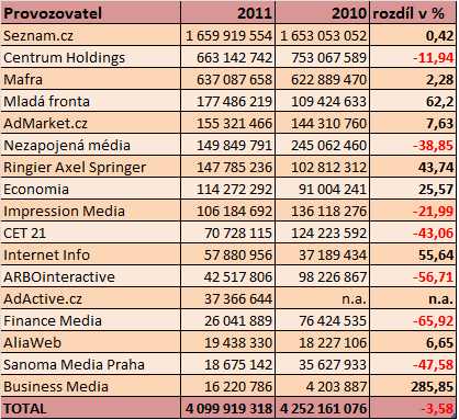 Pozn.: V případě AdActive jde o deklarovaná data pouze za období listopadu a prosince 2011. Celkový dosažený objem za rok 2011 je tak tímto zkreslen a jeho skutečná výše je za loňský rok násobně vyšší.