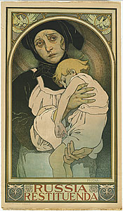 Plakát Alfonse Muchy rovněž vyniká svým jedinečným stylem. Dílo „Russia restituenda“ z roku 1922 zobrazuje vyčerpanou Matičku Rus a zesláblé dítě jako odraz devastující socioekonomické situace. Slouží jako prosba o pomoc.