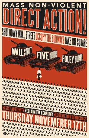 To, že plakát je stále mocný, ukazuje také kampaň amerického politického hnutí Occupy Wall Street, které s využitím plakátů a sociálních médií organizovalo své stoupence. Níže uvedený zaujme svým retrostylem a odkazem k událostem na náměstí Nebeského klidu v Pekingu roku 1989. Lépe řečeno ke slavné fotografii osamoceného muže s aktovkou v ruce stojícímu před konvojem tanků.