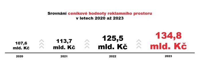 Mediální trh se v loňském roce stabilizoval, a podobně jako v minulých letech, i letos došlo podle monitoringu Ad Intel společnosti Nielsen k růstu ceníkové hodnoty mediálního prostoru (rok 2022 – 125,5 mld. Kč, 2023 – 134,8 mld. Kč**). Internet a televize si udržují pozici silných médií s kontinuálním nárůstem, růst zaznamenává i rádio. Tisk zůstává na stejné úrovni a venkovní reklama vykazuje pouze mírné zlepšení.