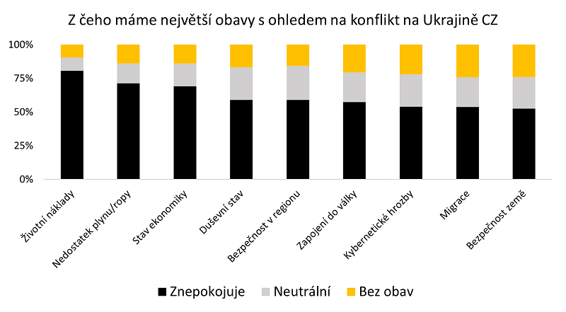 A čeho se Češi v návaznosti na dění na Ukrajině obávají nejvíce? Jedná se především o ekonomický aspekt věci, respektive zvýšení životních nákladů či zastavení dodávek plynu a ropy více než přímá bezpečnostní rizika. Nicméně i tak jednotlivá, ve výzkumu zmíněná rizika, pociťuje v české kotlině nejméně polovina dotázaných (viz graf).