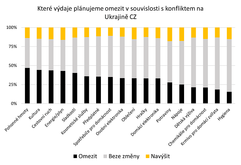 Konflikt navíc přichází v ekonomicky velmi nepřívětivé době, kdy již před jeho začátkem i v porovnání s EU zásadněji rostla inflace, dlouhodobě čelíme bytové a energetické krizi, doznívají i mnohé dopady covidové reality posledních dvou let. Jednoznačné odfiltrování výhradního dopadu konfliktu na spotřební chování je tak nereálné, sami respondenti ale přiznávají významnější omezování výdajů v přímém důsledku konfliktu.