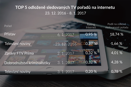 Odložené neboli archivní internetové sledovanosti, dominuje seriál Přístav (Prima) z 6. ledna s ratingem 1 %, který nicméně tvoří 19 % z celkové sledovanosti pořadu.
