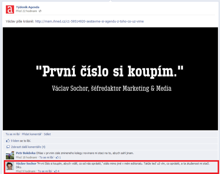 Zajímavé je na facebooku i vyjadřování podpory týdeníku, pro níž byla například použita citace Václava Sochora, šéfredaktora M&M. Její význam byl ale vytržením z kontextu podstatným způsobem změněn.