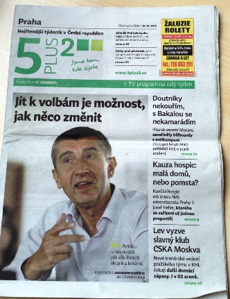 S blížícím se termínem předčasných voleb sílí podpora regionálních týdeníků 5plus2 politickému hnutí ANO Andreje Babiše. 5plus2 patří společnosti AGF Media, která je součástí skupiny Agrofert Andreje Babiše. Vydání, které bylo po celé republice distribuováno v nákladu 1 mil. výtisků ve čtvrtek 17. října, přináší na titulní straně celostránkový portrét Andreje Babiše, lídra hnutí ANO. Nejde přitom o inzertní celostranu, ale o redakční titulku. Takto významný prostor na titulní straně získávají jednotlivci v případě mimořádných událostí, a ani to nebývá vždy pravidlem.