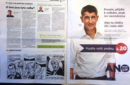 Podpora pro Babišovo hnutí pokračuje v rámci týdeníku inzertním vkladem v rozsahu osmi stran, který představuje volební program hnutí ANO. Na komentářové stránce se zamýšlí publicista Martin Komárek, který za ANO kandiduje v Libereckém kraji, nad přínosem jednotlivých politických stran. Úvahu končí konstatováním, že „Buď dáme hlas starým známým, kteří nás několikrát podvedli, oklamali a okradli. Nebo neznámým, kteří slibují, že to nikdy neudělají.“