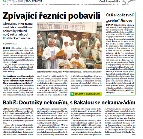 Následuje pochvala kampani o zpívajících řeznících (Kostelecké uzeniny, patří pod Agrofert) a vymezení se vůči společnému billboardu Andreje Babiše se Zdeňkem Bakalou, který hnutí ANO požaduje stáhnout. V aktuálním vydání se objevuje i rozhovor s Andreou Brzobohatou, kterou SPOZ bez udání důvodu vyškrtla z kandidátky („SPOZ mě vyřadila z kandidátky“) a komentář pod titulkem „SPOZ už účel splnila. Více netřeba“.