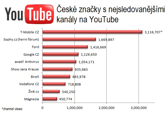 Nejsledovanějším českým brandem na YouTube je T-Mobile. V celkovém počtu předplatitelů kanálu (6,440) je však již úspěšnější softwarová značka Avast (6,639).