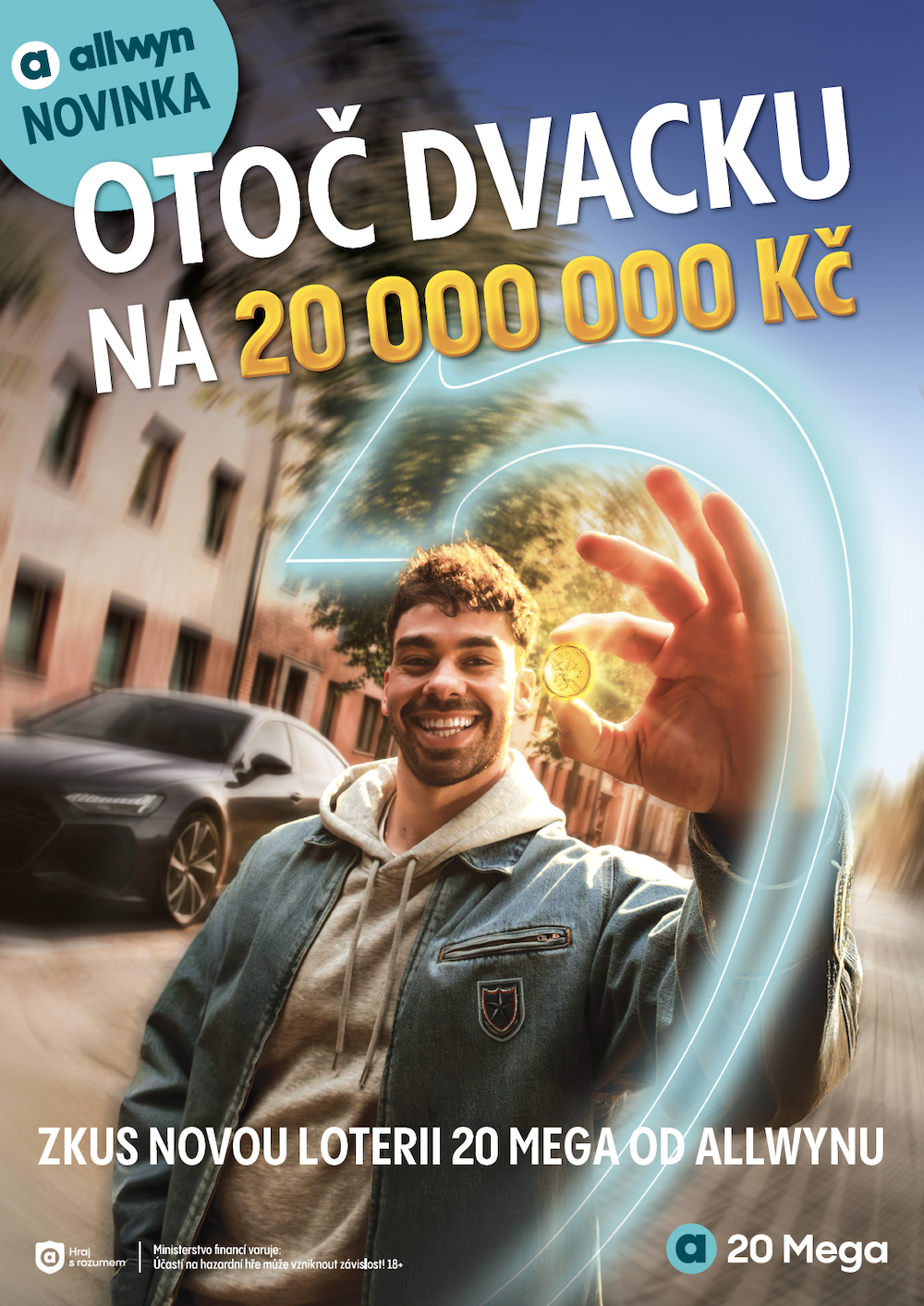 Společnost Allwyn startuje kampaň na podporu své nové loterie 20 Mega, ve které mohou zákazníci proměnit dvacetikorunu ve výhru až 20 milionů korun. Kreativní koncept pracuje s motivem „Otoč dvacku na 20 Mega“.