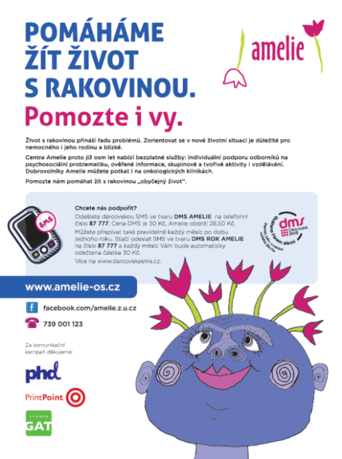 Občanské sdružení Amelie, poskytující bezplatné služby onkologicky nemocným a jejich blízkým, od poloviny února upozorňuje ve své kampani na problematiku života s rakovinou. Cílem je přesvědčit lidi jednak k finanční podpoře Centra Amelie, jednak vysvětlit potřebu psychosociální pomoci jakožto relevantní součást péče o lidi s rakovinou.