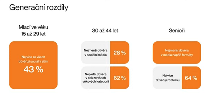 Jednotlivé věkové skupiny se liší v míře důvěry v jednotlivé mediatypy. Zatímco mladí ve věku 15-29 let nejvíce důvěřují sociálním sítím (43 %), lidé ve věku 30-44 let sociálním sítím důvěřují nejméně (28 %). Senioři obecně méně důvěřují médiím, nejvyšší důvěru mají k rozhlasu (64 %).