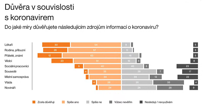 V době pandemie získávali lidé informace především z televize a z internetu, na třetím místě se umístila rodina, dále přátelé a známí a sociální sítě. Nejlépe podle výzkumu informovala o pandemii ČT, třetí nejčastější spontánní odpovědí byl Instagram a Dominik Feri. Podle výzkumu byla ale celkově důvěra novinářům jako zdrojům informací o koronaviru nízká (důvěřuje necelá třetina). Při referování selhaly i vládní zdroje, naopak lidé nejvíce důvěřovali lékařům a potom svým rodinným příslušníkům a známým.