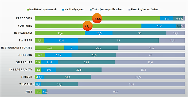 Nejznámějšími a nejnavštěvovanějšími sociálními médii zůstává i nadále dvojice YouTube a Facebook, které vyzkoušelo již 94 %, respektive 92 % českých uživatelů internetu. Výrazně posílil Instagram, který jako jediný roste stejně dynamicky jako v předešlých letech. Osobní zkušenost s ním potvrzuje 52 % uživatelů internetu, což je o šest procentních bodů více než v loňském roce.