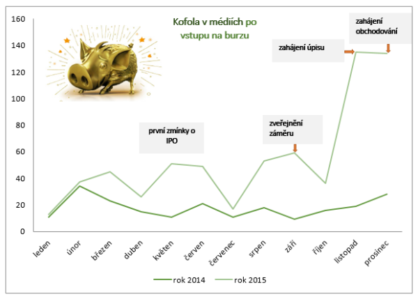Celkový počet mediálních výstupů společnosti Kofola (se započítáním výstupů nad rámec IPO) se v období květen – prosinec 2015 ve srovnání se stejným obdobím roku 2014 navýšil téměř dvojnásobně (ze 708 na 1409 článků). Počet výstupů, v rámci nichž byl název společnosti Kofola uveden v titulku zprávy, vzrostl ve sledovaném období téměř trojnásobně – ze 133 na 401 článků.