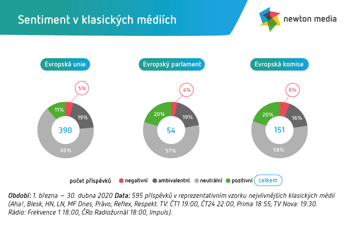 Pozitivní sentiment se začal formovat s tím, jak se aktivizovaly Evropská komise a Evropský parlament. Byl spjat s mohutnou hospodářskou pomocí, která byla přislíbena členským státům, ale i se společnými repatriačními lety občanů EU, společnou distribucí zdravotnického materiálu a konečně i s vývojem vakcíny proti viru. Ze sociálních médií vyváženým sentimentem vymykal Twitter.