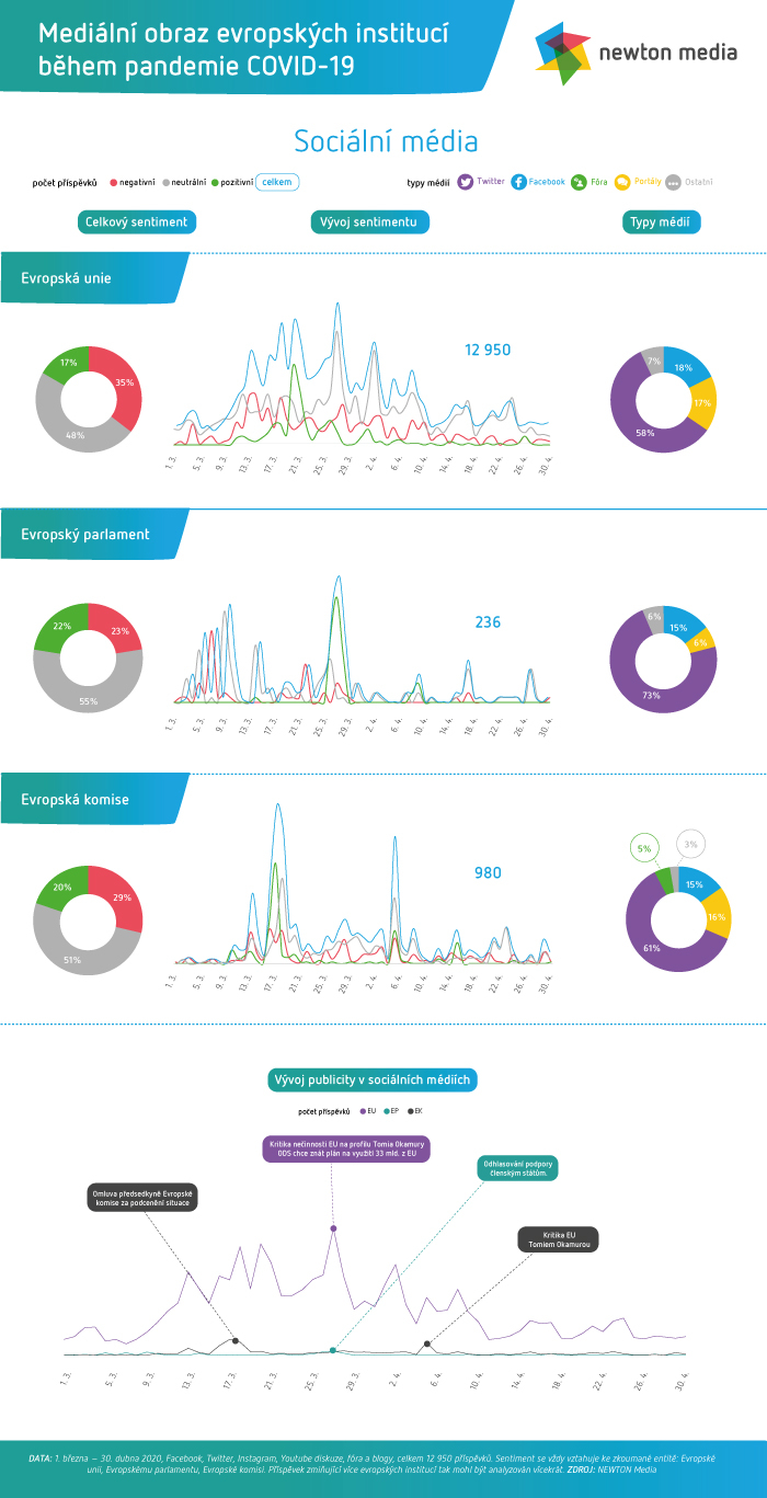 V sociálních médiích byl sentiment evropských institucí o třídu horší, zejména s ohledem na negativní tón. Jestliže na Twitteru byla ještě situace v rovnováze, na Facebooku atakovala kategorická kritika 40% hranici a v případě diskusí pod články se dokonce blížila 60 %. Evropa v očích svých kritiků řešila místo „skutečného problému“ vesměs zástupné věci jako třeba klimatickou agendu (Green Deal, klimatické cíle), a tváří v tvář pandemii se ozřejmila její nepotřebnost. Byla to především tato myšlenková šablona, která stála za většinou reputačních škod.