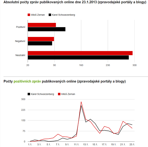 Společnost Semantic Visions aktualizovala svoji analýzu zkraje tohoto týdne. Z analýzy online textů konstatovala, že: „V posledních dnech se Karel Schwarzenberg dokázal vypořádat s krajně negativní kampaní Miloše Zemana. Ve středu po delší době dokonce získal v online médiích (zpravodajské portály a blogy) mírně pozitivnější emoční náboj než Zeman. Schwarzenberg měl nejen více pozitivních článků, ale i méně negativních. Na Facebooku Schwarzenberg svůj náskok nad Zemanem setrvale zvyšuje. Zde je důležitý počet postů a komentářů (tj. celková aktivita) a dále pak jejich míra pozitivního emočního náboje. Méně pak negativní detailní sentiment, který je v obou případech spíše dílem fanoušků z protikandidátova tábora, resp. odsudků jejich aktivity ve stylu ‚ať nám sem nelezou a našeho kandidáta nehaní‘. Pokud mladí lidé, tj. převážně uživatelé Facebooku přijdou k volbám v dostatečném počtu, Schwarzenberg volby vyhraje,“ odhaduje Semantic Visions.