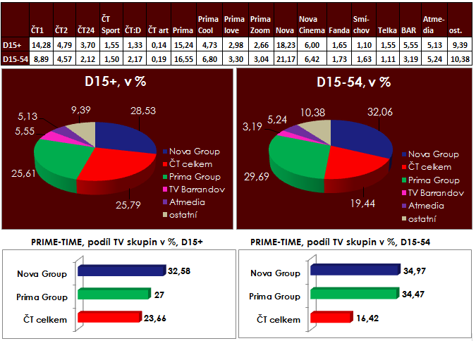 Komerční skupiny Nova a Prima tak dosáhly vyšších podílů v hlavním vysílacím čase než kanály České televize. Zejména v mladší skupině 15-54 bylo jejich postavení v sobotu večer v prime-timu vyrovnané.