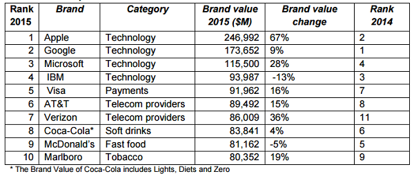 Značka Apple se podle nového žebříčku BrandZ vrátila na pozici nejhodnotnější světové značky. V novém pořadí tak předstihla Google. Hodnota Applu má dosahovat 247 mld. USD, což je meziroční růst o 67 %. Za návratem na první pozici má stát úspěch telefonu iPhone 6. Google také meziročně rostl, a to o 9 % na hodnotu 174 mld. USD. Na třetí místo se nově dostala značka Microsoft, které žebříček přisuzuje hodnotu 115,5 mld. USD.