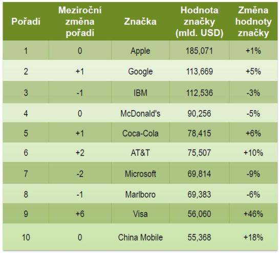 Nejhodnotnější světové značky jsou Apple, Google, IBM, McDonalds a Coca-Cola, vyplývá z žebříčku BrandZ.