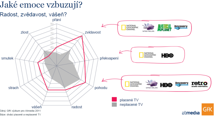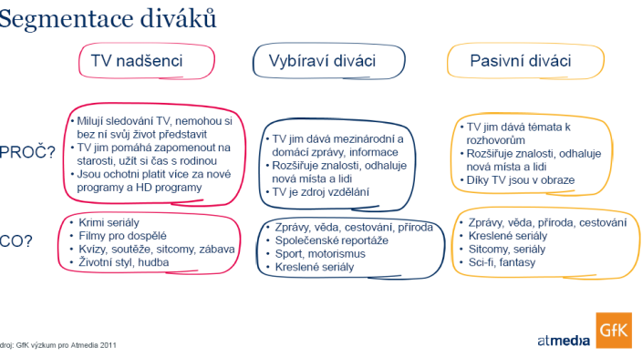 Atmedia a výzkumná agentura GfK Czech také představily výzkum televizního diváka, ve kterém zjišťovaly rozdíly mezi návyky a postoji diváků placených a neplacených TV kanálů. Závěry výzkumu, ve kterém byli diváci rozděleni do tří základních segmentačních skupin, ukázaly, že diváci placených kanálů jsou většími televizními nadšenci (52 %) než diváci neplacených stanic (44 %) - definice TV nadšence viz níže.