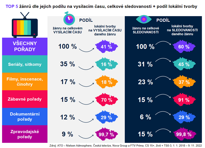 Seriály a sitkomy (jakožto žánry s obecně největším podílem na vysílacím času a také největším podílem na sledovanosti) jsou na stanicích třech hlavních TV skupin z 16 % zastoupeny lokální tvorbou. Podíl českých seriálů na celkové sledovanosti je však několikanásobně vyšší, tvoří 45 %. Podobně u filmů, inscenací a činohry, jež mají jako žánry celkově druhý největší podíl na vysílacím času i sledovanosti, má 37% podíl na sledovanosti lokální tvorba. U zábavných pořadů tvoří podíl sledovanosti českých pořadů dokonce 91 % - u nich je však také (na rozdíl od seriálů a filmů) vysoký podíl lokální tvorby daný už v samotném vysílání. Nepřekvapivě téměř 100 % podílu sledovanosti českých pořadů vykazuje zpravodajství, u něhož se zahraniční tvorba vyskytuje na obrazovkách třech hlavních televizních skupin jen v 0,4 % vysílacího času. „Je vidět, že pro české diváky je domácí tvorba dlouhodobě autentická, relevantní a dokáže je přivést k TV obrazovkám,“ komentuje výsledky Petr Miláček, ředitel analýz z TV Prima.