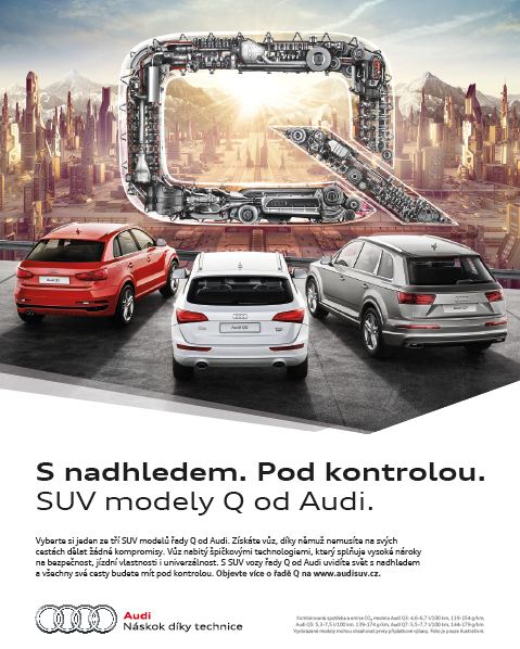 Audi od března spustí novou lokální kampaň na podporu svých modelů Q v kategorii SUV. Se sloganem: „S nadhledem. Pod kontrolou.“ představí modely Q3, Q5 a Q7. „Novou kampaní chceme ještě více rozšířit povědomí potenciálních zákazníků o našich modelech Q v populárním segmentu prémiových vozů SUV,“ vysvětluje Tomáš Velek, ředitel divize Audi společnosti Porsche ČR.