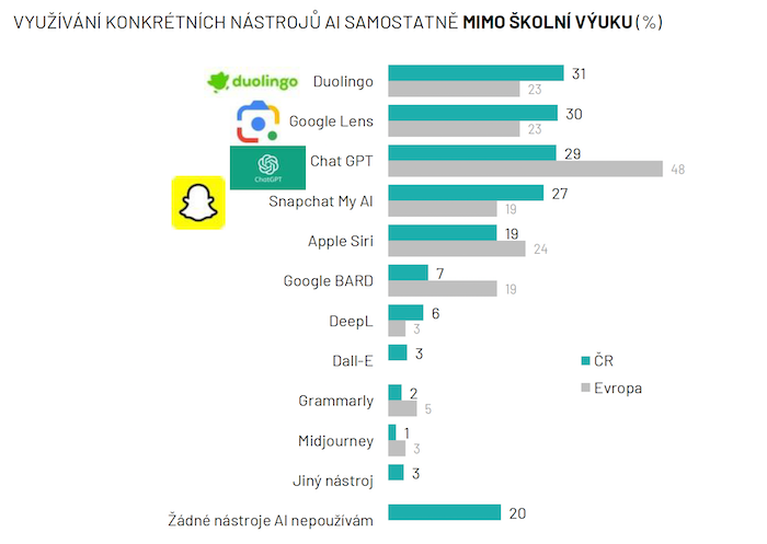 Ve škole pracuje s AI 64 % dotázaných, výrazněji jsou to studenti gymnázií (83 %), méně často naopak děti z rodin s čistým příjmem do 30 tisíc korun měsíčně. Mezi nejčastější nástroje patří Google Lens, Chat GPT a Duolingo. Ve srovnání s Evropou, kde situaci zmapovala mezinárodní studie Vodafone Foundation, je používání některých nástrojů u českých dětí poněkud „pozadu“, nejvýraznější rozdíl panuje u ChatGPT, který v zahraničí používá 47 % dotázaných. Více než třetina (36 %) mladých ve škole AI nepoužívá.