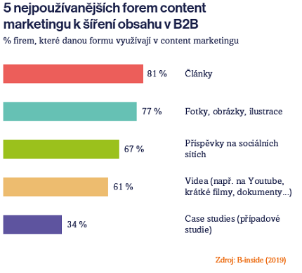 Se sociálními médii souvisí také content marketing, který zažívá v B2B marketingu velký rozmach. Procento B2B firem, které se letos věnovat budou věnovat tvorbě a šíření obsahu, se oproti loňsku více než zdvojnásobilo. Nejčastěji využívají české firmy pro šíření články. Přes tři čtvrtiny B2B firem je doplňují o fotografie, obrázky či ilustrace a 67 % firem využívá příspěvky na sociálních sítích, a to zejména na Facebooku, YouTube, LinkedInu a Instagramu. Čtveřici nejpoužívanějších forem content marketingu v Česku uzavírají videa. Oproti zahraničí však čeští B2B marketéři podstatně méně často využívají například case studies, e-booky a whitepapery či infografiky (65 %).