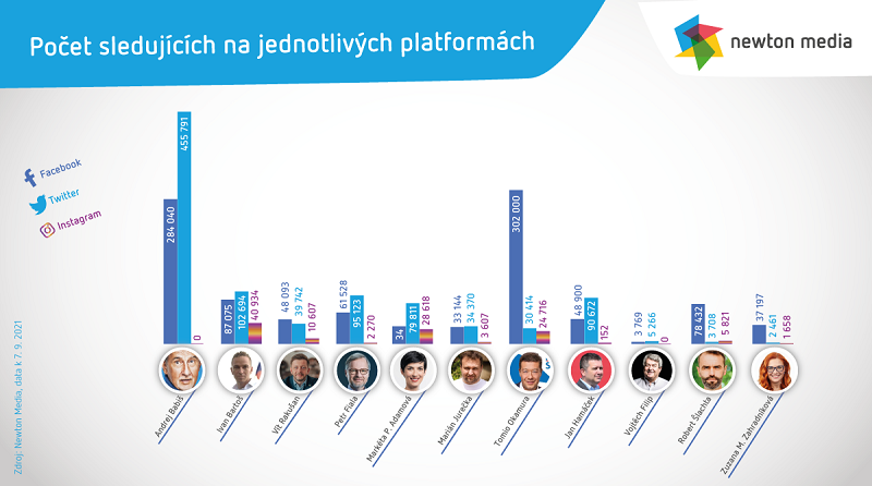 Z volebních lídrů má nejvíce sledujících na Facebooku předseda SPD Tomio Okamura. Na Twitteru je nejvíc sledován profil premiéra a předsedy ANO Andreje Babiše, dominují mu však příspěvky představitelů koalice SPOLU. Na Instagramu je nejúspěšnější Ivan Bartoš, předseda České pirátské strany. Vyplývá to z analýzy společnosti Newton Media, která se zaměřila na lídry jedenácti politických stran s potenciálem dostat se do Sněmovny.