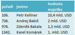 V žebříčku magazínu Forbes, který každoročně sestavuje žebříček nejbohatších lidí, se letos objevují čtyři podnikatelé, kteří působí v Česku. Vedle Petra Kellnera, Zdeňka Bakaly a Andreje Babiše, je to nově také podnikatel Karel Komárek.