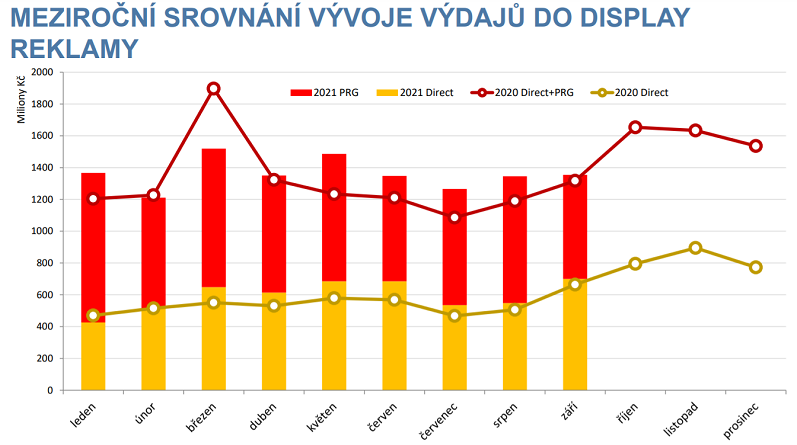 Monitorovaný objem investic směřovaných do internetové display reklamy na tuzemském trhu v meziročním srovnání v letošním roce roste v průměru o šest procent. Vyplývá to z dat projektu AdMonitoring, který pro SPIR zajišťuje Nielsen Admosphere. Meziroční vývoj se lišil v jednotlivých částí roku podle průběhu epidemie covid-19. Nejslabší byl v únoru a v březnu, naopak nejvyšší v květnu a v letních měsících. Do výsledku je započítána displayová reklama nakoupená přímo a display nakoupený programaticky. Prvně jmenovaná roste letos o něco rychleji (podle monitoringu cca +10 %).