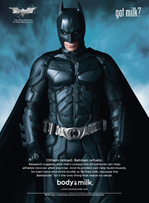 Batman byl rovněž jednou z tváří americké kampaně Got milk? (Už jsi měl mléko?), jejímž záměrem je podporovat konzumaci kravského mléka v populaci. Reklama s Batmanem upozorňuje na skutečnost, že Batmobil není to jediné, co potřebuje natankovat.