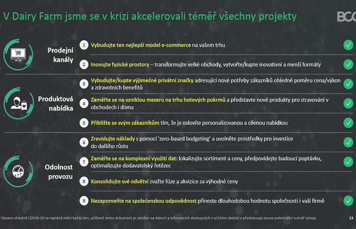 Skupina Dairy Farm má velký záběr v rámci svého byznysu, nicméně podle Davida Hofmana zaznamenaly propad segmenty gastro, kosmetika a lékárny. V retailu jídla se trh vyvíjel stejně jako v Evropě, kdy si lidé dělali zásoby. Výhledově by viděl jako základní faktor úspěchu rychlost k vypořádání se se změnami a zkoušet nové věci. „Spotřebitel nám v tomto období dává mandát k nedokonalosti a máme možnost si zkusit nové věci," uvedl David Hofman. Umění přizpůsobit se se liší, firmy mohou restrukturalizovat portfolio, objeví se spousta akvizičních příležitostí, každopádně je dobré na změny včas reagovat.