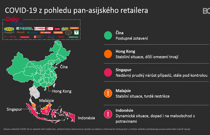 Zatímco Čína se podle něj pomalu zotavuje z pandemie, Hongkong pociťuje velmi silný propad kvůli absenci kupní síly právě z Číny. Singapur řeší úplně jinou situaci, protože se tam zdesetinásobil počet nakažených, Malajsie díky tvrdým opatřením situaci stabilizovala, ale za cenu obrovských nákladů. V Indonésii se situace vyvíjí asi nejhůř, ukazuje se, že propad je i v retailu jídla. Lidé mají strach chodit do obchodů, ale online a doručování tam nejsou tak rozšířené.