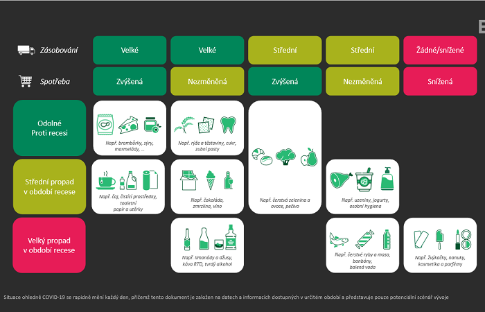 V BCG vytvořili globální predikci k vývoji jednotlivých kategorií v nákupním košíku. Podle studie očekávají, že trvanlivé potraviny budou nadále odolné vůči recesi společně s ovocem, zeleninou a pečivem. Například u čistících prostředků, čokolád, vína a zmrzlin očekávají střední propad v nákupech. Velký propad pak bude nejspíš v kategorii nealka, čerstvého masa, ryb, nebo cukrovinek. Podobně ještě více propadnou impulsní kategorie, které se za karantény moc nenakupovaly, jako jsou žvýkačky, nanuky a kosmetika či parfémy.