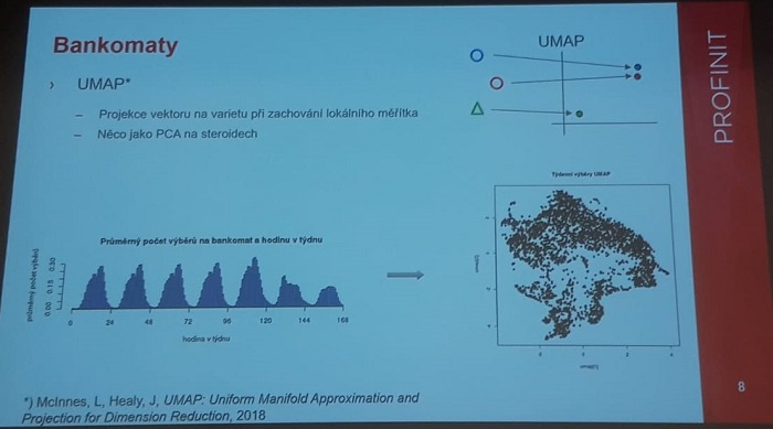 Jako příklad uvedl projekt, kdy se firma snažila porozumět bankovním transakcím. Z dat při vybírání v bankomatu jde zjistit řadu informací. Na grafu ukázal týdenní výběr z průměrného českého bankomatu, kdy klasicky přes týden je frekvence vyšší než o víkendu (nejvíce se vybírá v pátek odpoledne). Když se 168 hodnot promítne do 2D prostoru, je možné vidět, že existují bankomaty s podobnou frekvencí výběru. Z dat je možné vyčíst řadu věcí, jak se vybírá v Praze a jak mimo Prahu, kdy nejčastěji vybírají lidé v metru. Dokonce, kde vybírají peníze častěji muži než ženy. Podle zvoleného segmentu lze pak zjistit, kdy je vhodné lidi oslovit. Profinit umí najít i tzv. pseudosociální sítě, odhalit komunity a detekovat změnu. „Dá zjistit i to, zda vůbec máte zákazníkovi nabízet daný produkt, zda v rámci jeho skupiny by o něj byl zájem. Je ale dobré mít na začátku zformulovanou hypotézu, co vlastně potřebuji zjistit,“ dodává Paščenko.