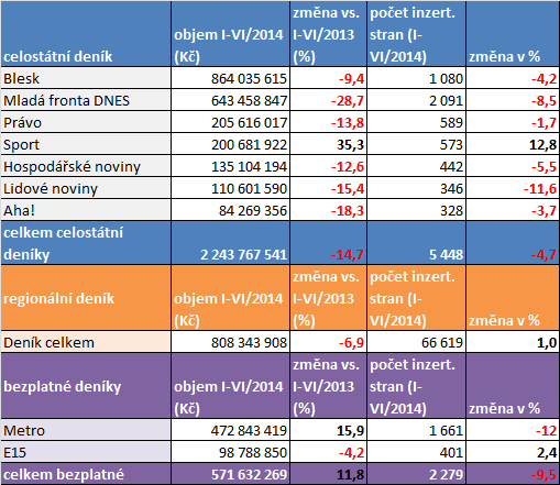 Relativně příznivě si stojí podle monitoringu bezplatné deníky, které svůj inzertní objem v meziročním srovnání zvýšily zejména zásluhou deníku Metro.
