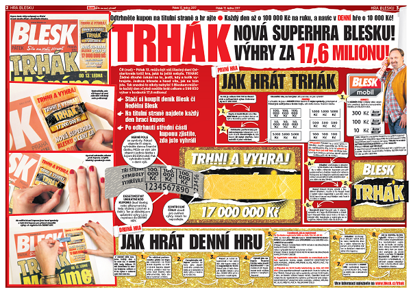 Deník Blesk společnosti Czech News Center zahajuje od pátku 13. ledna novou soutěžní hru Blesk Trhák. Má jít o jednu z největších herních soutěží za poslední roky na mediálním trhu vůbec. Jen v samotné hře chce Blesk rozdat výhercům přes 17 mil. Kč. Další výdaje jsou směřovány do podpory nové hry, která se objeví napříč všemi tituly společností CNC a CN Invest, na zhruba 60 billboardových plochách, v místě prodeje (přednostní vystavení, plochy v sítích HDS a Geco), na všech hlavních televizních a rádiových stanicích a také na sociálních médiích. Komunikace zahrnuje i všechny uživatele Blesk Mobilu prostřednictvím SMS zpráv.