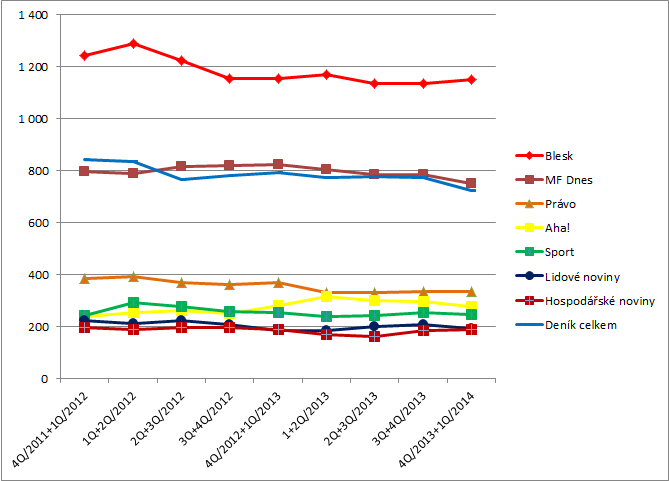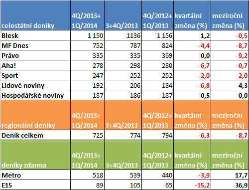 Zdroj: Media projekt, 4Q/2013+1Q/2014, Unie vydavatelů, SKMO, Median, STEM/MARK