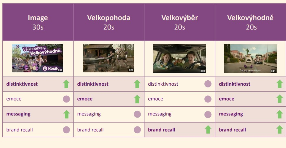 Claim „Velkonákupy. Velkovýhodně“ vznikl z rozsáhlého testování více než stovky variant. Odrazil se od zákaznické motivace „široký výběr“, kterou uvedlo 95 % oslovených. Důležitým cílem bylo zároveň jemně poukázat na zákaznické zvyklosti a nabídnout alternativu.