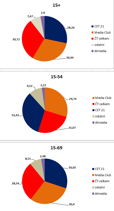 V celkovém podílu na reklamním trhu zůstává v celodenní sledovanosti v 15+ nejsilnější Česká televize, v 15–69 byl těsně nejsilnější Media Club a v 15–54 skupina Nova.